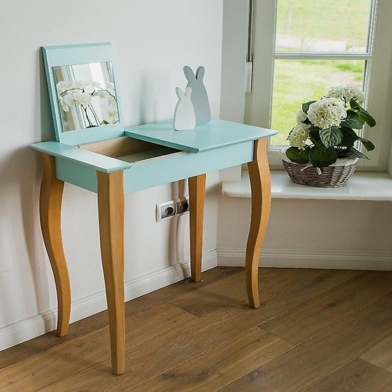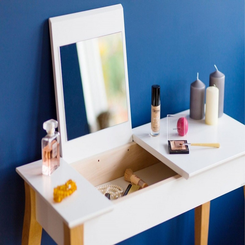 The vanity table is made of beech wood and laminated and lacquered MDF. This makes it not only a beautifully designed piece of furniture but also a durable product. The colored legs are finished in an elegant black color, and the tabletop is 19 mm thick, giving it a sturdy and solid appearance.