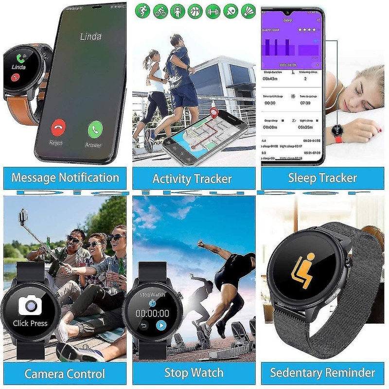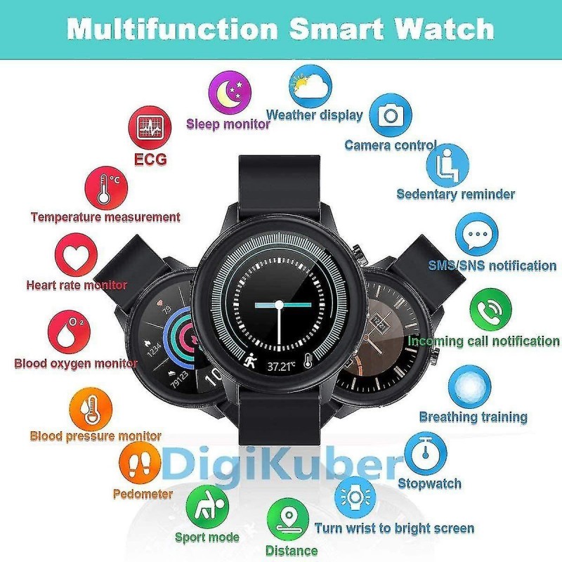 VARIOUS FUNCTIONS such as time and date display, weather display, call and message notification, step counter, calorie consumption record, sports mileage record, 7 sports modes, heart rate monitor, ECG / PPG / Ai diagnosis, camera control, sleep monitor, sedentary reminder, stopwatch, breathing training. 24-HOUR BODY TEMPERATURE MONITOR It can measure your body temperature for 24 hours, the body temperature data can be saved in the [SmartHealth] APP, you can monitor your body temperature and monitor your health at any time. SPORTS AND HEALTH MANAGEMENT Track multiple sports and health data measurement: Multi-sport mode, pedometer, distance, calories; ECG / PPG / AI diagnosis / heart rate monitor. Pay attention to your health all the time. The sports and health data of the smart watch are for reference only, please listen to the doctor's advice. SLEEP MONITOR & WEATHER DISPLAY Sleep monitoring function: When you fall asleep, the smart watch will automatically calculate your sleep quality and sync the data to the app. You can know your sleep quality. The weather display function will display current weather information and air quality. (Note: You need to get your phone's location information to view the weather.) IP68 WATERPROOF & MAGNETIC CHARGING IP68 has excellent waterproof performance and can meet most daily needs. (Note: Do not immerse it in deep water for a long time. Also do not use it in hot springs or hot baths.) Magnetic suction charging, charging time is about 3-4 hours, using time is about 5-13 days, standby 20-40 days.
